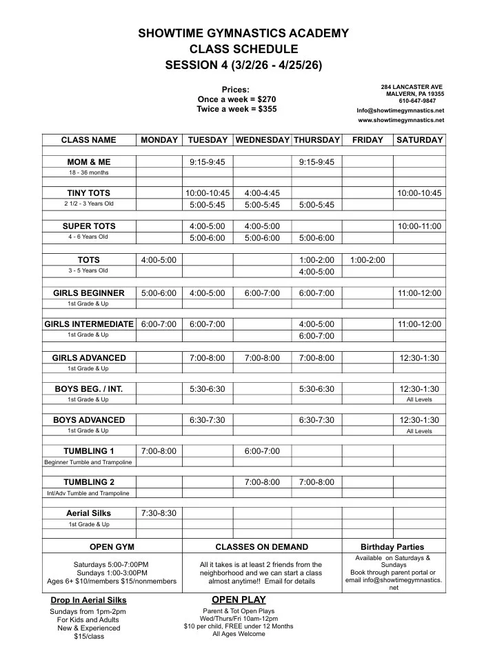 Price: One class per week = $270